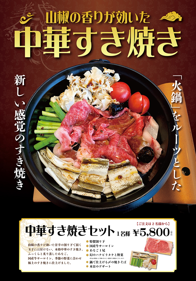 山椒の香りが効いた甘辛の割り下で頂く、玉子には付けない、本格中華のすき焼き。